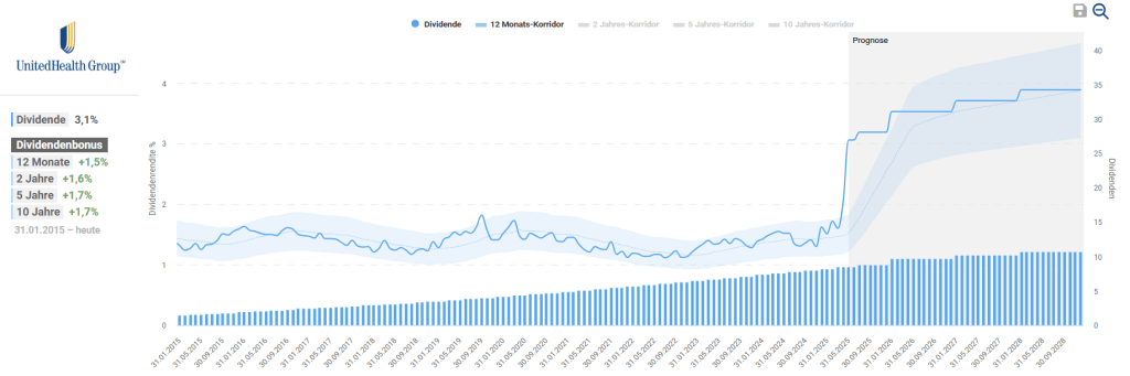 Die Dividendenrendite ist durch den gefallenen Kurs auf 3 % angestiegen – ein Wert, den man bei UnitedHealth so noch nicht gesehen hat.