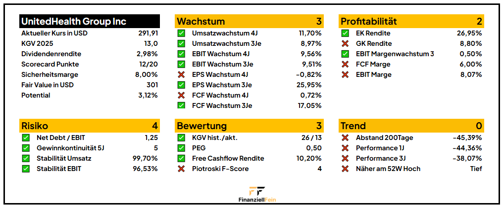 In unserer ersten Analyse hatten wir den fairen Wert der UnitedHealth-Aktie noch bei rund 516 USD veranschlagt – gestützt auf stabile Wachstumsraten, hohe Profitabilität und ein starkes Vertrauen in das Geschäftsmodell.