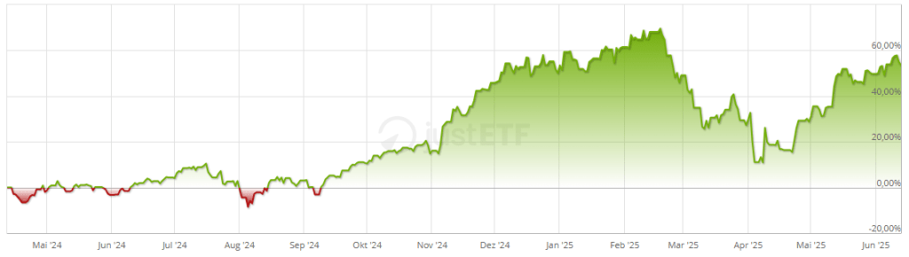 Seit Auflegung im April 2024 bis Juni 2025 verzeichnete der ETF in Euro eine Rendite von rund 53,5 %, was insbesondere in der bullischen Tech-Phase bemerkenswert stark ausfiel. Auch die Ein-Jahres-Performance liegt mit 51,51 % auf sehr hohem Niveau.