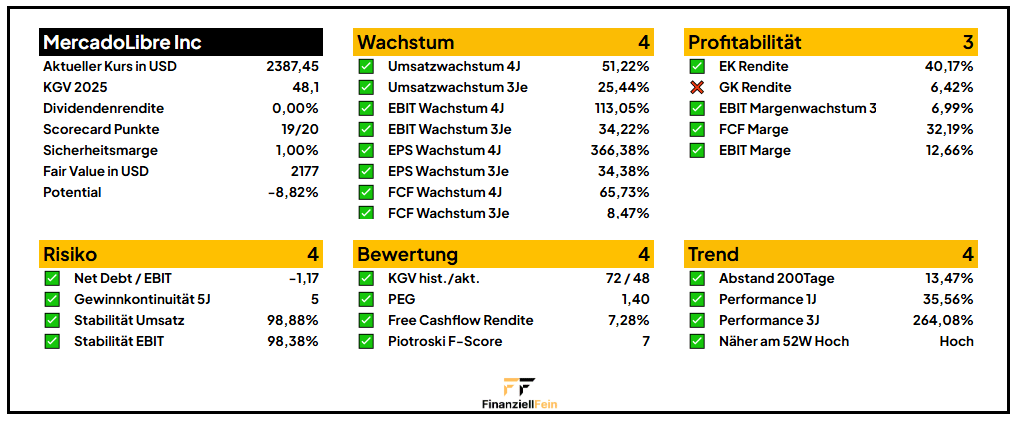 Auch in puncto Risiko zeigt sich MercadoLibre von seiner besten Seite. Das Unternehmen arbeitet faktisch schuldenfrei – mit einer Netto-Verschuldungsquote von –1,17 hat es mehr liquide Mittel als zinspflichtige Verbindlichkeiten. Die Gewinnkontinuität über die letzten fünf Jahre sowie die hohe Stabilität bei Umsatz und EBIT von jeweils über 98 % unterstreichen die Robustheit des Geschäftsmodells. Trotz operativer Tätigkeit in oft volatilen Märkten zeigt das Unternehmen eine bemerkenswerte Widerstandsfähigkeit – wirtschaftlich wie finanziell.