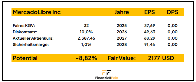 Noch beeindruckender fällt allerdings die Entwicklung der Profitabilität aus: Das EBIT – also der operative Gewinn – wuchs in den letzten vier Jahren um über 113 %, während sich der Gewinn pro Aktie im selben Zeitraum sogar mehr als vervierfacht hat. Diese Zahlen lassen erkennen, wie MercadoLibre zunehmend Skaleneffekte realisiert und von seinem Ökosystem aus Marktplatz, Zahlungsdienstleistungen und Logistik profitiert.