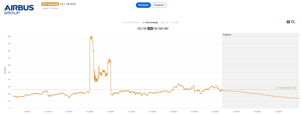 Trotz der aktuellen operativen Hürden liefert die fundamentale Bewertung ein spannendes Signal. Ein Blick auf die historische Bewertung zeigt, dass Airbus mit einem bereinigten KGV von 24,1 aktuell unter dem 10-Jahres-Durchschnitt von 25,8 notiert.