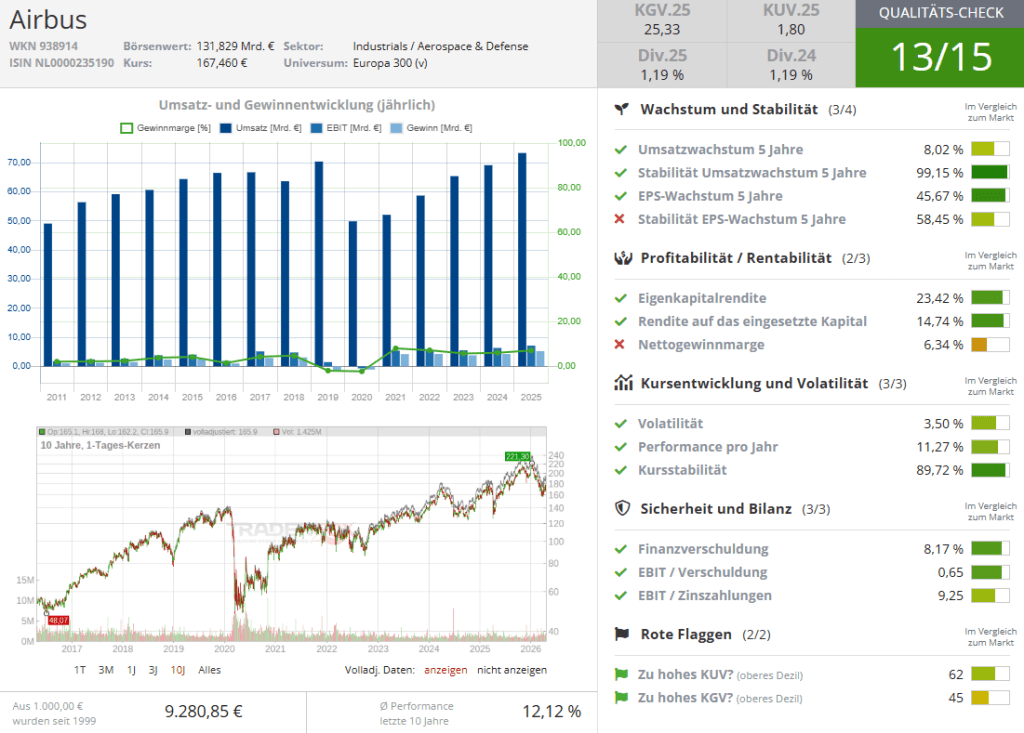 Airbus ist eine Qualitätsaktie, die mit 13/15 Punkte für langfristig orientierte Anleger als Investment gut geeignet ist. Das Unternehmen hat bewiesen, dass es langfristig Werte schafft und eine gute Rendite liefert.
