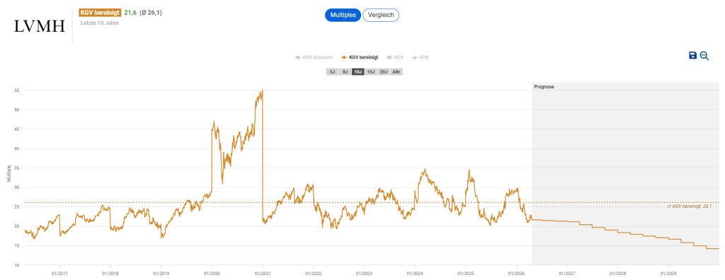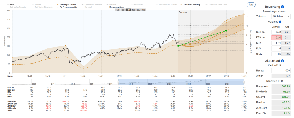 Gleichzeitig wird diese Unsicherheit mit einem Abschlag auf die Bewertung vergütet. Das bereinigte KGV von 21,6 notiert massiv unter dem 10-Jahres-Durchschnitt von 26,1.