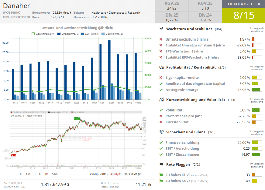 Zwar erreicht Danaher nur 8 von 15 Punkten im Traderfox Qualitäts-Check. Aufgrund der M&A Strategie mit kontinuierlichen Abspaltungen einzelner Geschäftsbereiche sind die Kennzahlen bei Umsatz- und Gewinnwachstum nicht aussagekräftig. Mit einer durchschnittlichen Jahresperformance von über 11% in den letzten 10 Jahren hat Danaher bewiesen, dass man Wert für die Aktionäre schafft.