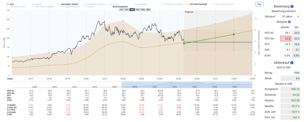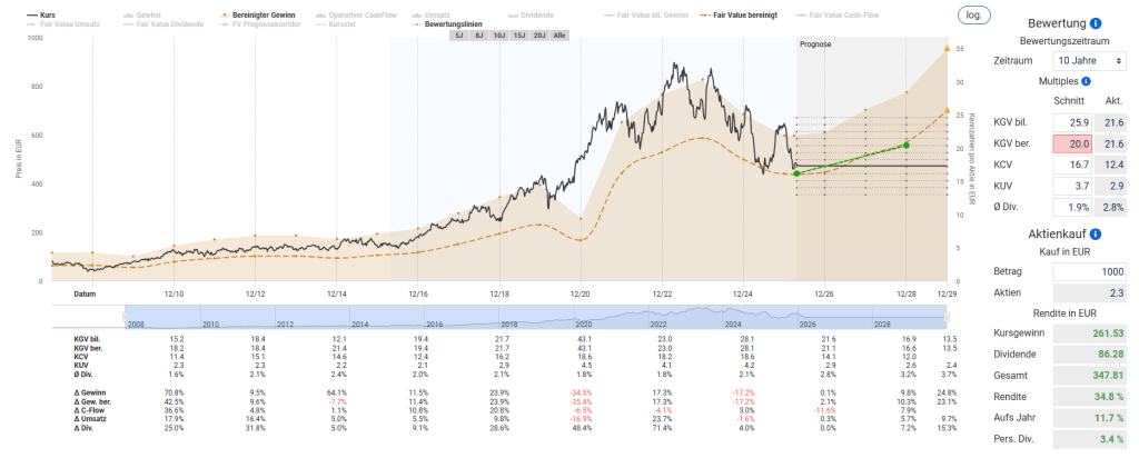 Angesichts der Prognose eines langfristig wieder zweistellig wachsenden Gewinns pro Aktie (EPS) bietet die Aktie erhebliches Aufwärtspotenzial, sobald die Bewertung (Multiple) zu ihrem historischen Mittelwert zurückkehrt.