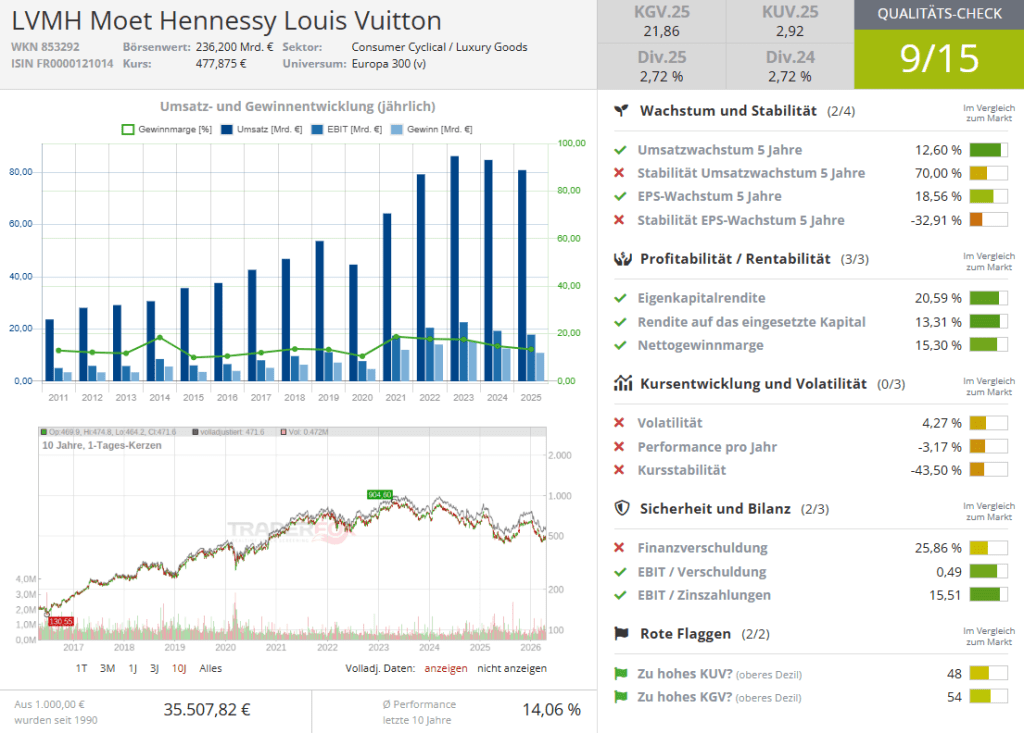 Trotz des Kriegs im Nahen Osten, der das Gruppenwachstum um rund einen Prozentpunkt schmälerte, erzielte LVMH ein organisches Umsatzwachstum von 1 % auf 19,1 Milliarden EUR. In der Golfregion (ca. 6 % des Konzernumsatzes) brachen die Mall-Umsätze in Dubai teilweise um 50 % bis 70 % ein. Nur gut, dass LVMH weltweit tätig ist.