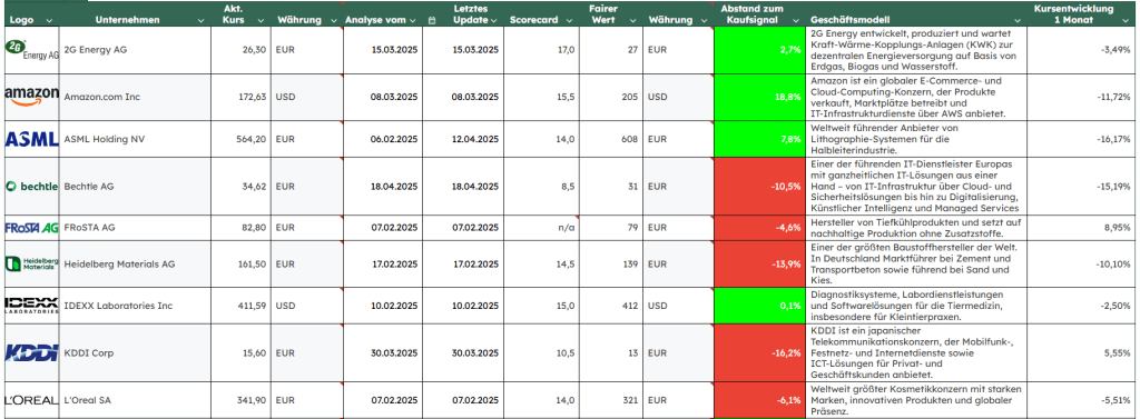Auf meiner Watchlist finden sich alle Unternehmen, die bereits einer gründlichen Analyse unterzogen wurden. Der Abstand zwischen dem aktuellen Kurs und dem fairen Wert wird präzise verfolgt, und genau dieser Abstand entscheidet, wann der richtige Moment für einen Kauf gekommen ist.